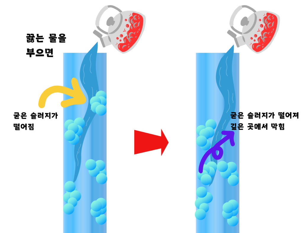 끓는 물을 붓게 되면 배관이 경화되고, 파손되어